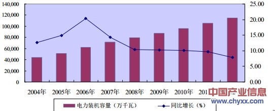 2004-2012年中國(guó)發(fā)電總裝機(jī)容量連續(xù)快速增長(zhǎng),“十一五”期間年均新增裝機(jī)容量近8,500萬(wàn)千瓦,遠(yuǎn)高于“十五”期間約4,600萬(wàn)千瓦的年均新增容量。2012年發(fā)電總裝機(jī)容量達(dá)到11.45億千瓦,2015年,國(guó)內(nèi)發(fā)電機(jī)裝機(jī)容量將達(dá)到14.37億千瓦左右,將超過(guò)美國(guó)而躍居世界第一。