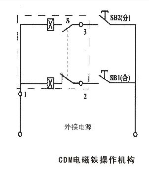 CDM電磁鐵操作機(jī)構(gòu)(配用MRMl-63,100,225)接線圖見下圖(虛框內(nèi)為斷路器外符號(hào)說明:SBi、SB2操作按鈕(用戶自備)